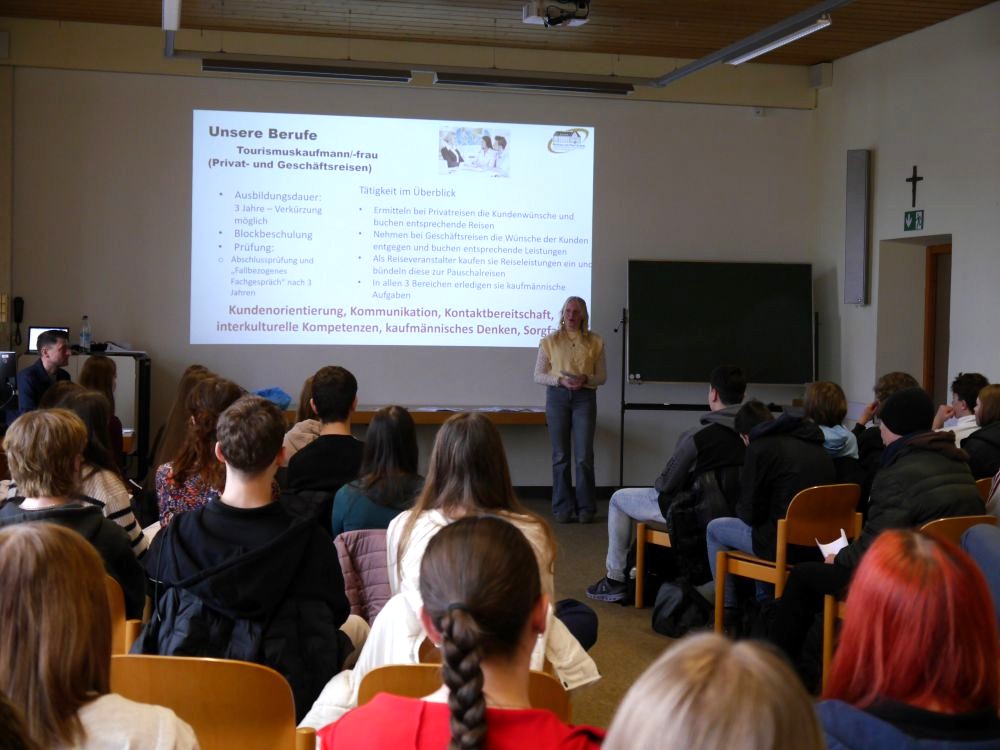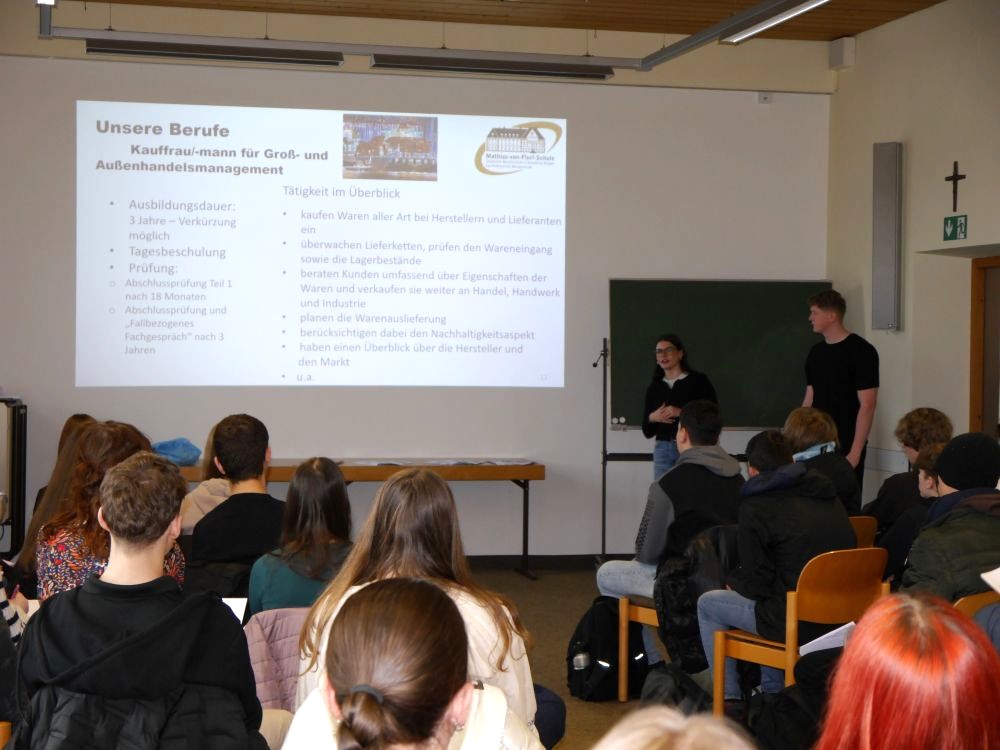 Der Besuch begann mit einer herzlichen Begrüßung durch Herrn Mauerer und dem stellvertretenden Schulleiter, Herrn Gebhard. Im Anschluss folgte eine kompakte Präsentation, die einen umfassenden Einblick in die Mathias-von-Flurl Berufsschule bot: von unseren Ausbildungsberufen und schulischen Angeboten über Unterstützungs- und Beratungsstrukturen bis hin zu Perspektiven nach erfolgreichem Abschluss. Unterstützt wurde die Vorstellung durch Schülerinnen und Schüler aus verschiedenen Ausbildungsgängen, die aus ihrer Praxis berichteten und Fragen zur dualen Ausbildung, zu Unterrichtsinhalten und zu betrieblichen Anforderungen beantworteten.