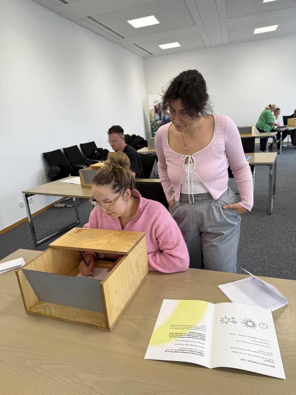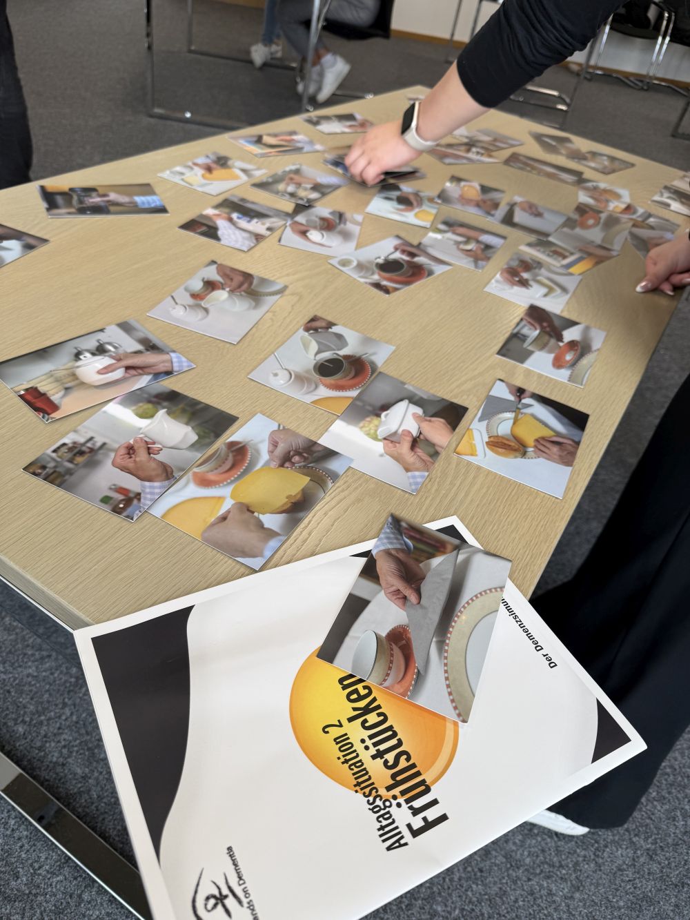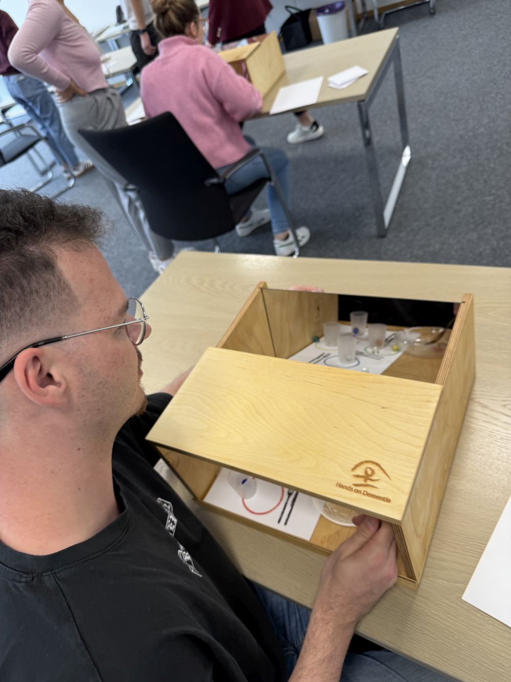 Mithilfe einer Anleitung und diversen Utensilien, versuchten wir immer zu zweit die Situationen den Umständen entsprechend zu meistern. Eine Person leitete die Aufgabe jeweils an, durfte jedoch keine Hilfestellung geben. Am Ende wurde getauscht, sodass jeder einmal die alltäglichen Einschränkungen von Demenzpatienten selbst erleben konnte.