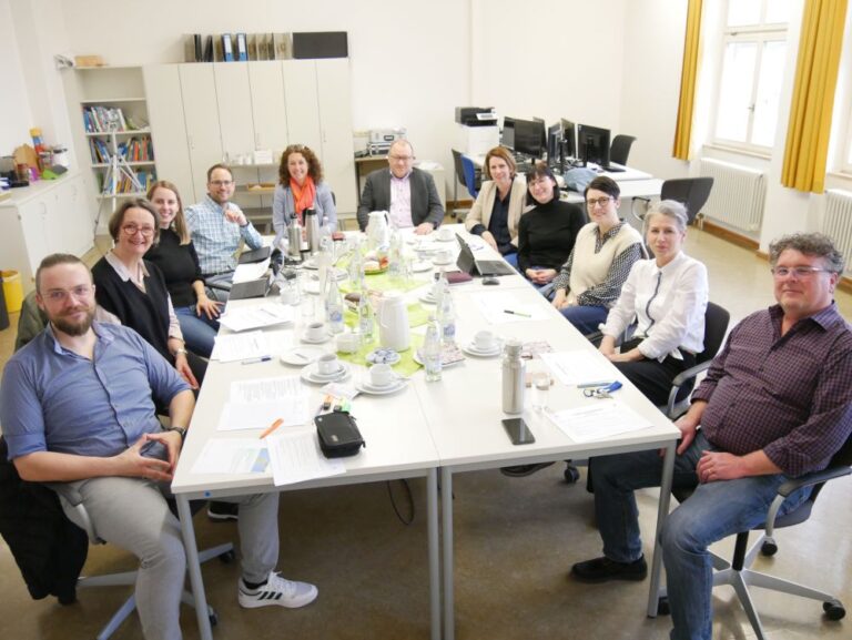 Das QmbS-Beratertandem Frau Troidl (2. v.r.) und Herr Baumann (1. v.r.) mit Mitgliedern des QmbS-Teams bei der Nachhaltigkeitssitzung im Februar 2024