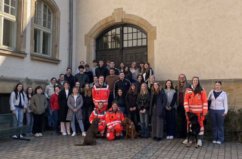 Zum Abschluss war die BRK-Rettungshundestaffel Straubing-Bogen zu Gast. Unter der Leitung von Christina Artmann erhielten die Schülerinnen und Schüler Einblicke in die Ausbildung der Hunde und die Arbeit der ehrenamtlichen Einsatzkräfte.